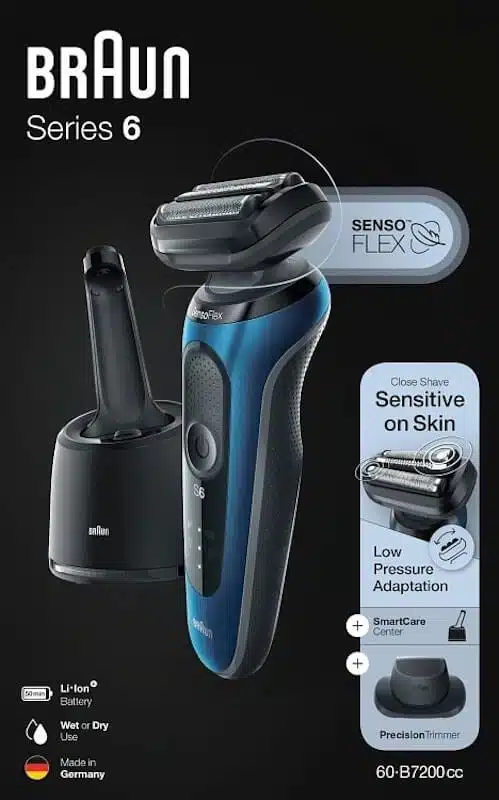 Det här är det bästa valet för dig som kan investera lite mer i en toppmodell. Braun Series 6 60-B7200cc erbjuder nära och skonsam rakning. Den passar perfekt för personer med känslig hud. Det rörliga SensoFlex-huvudet är dermatologiskt testat och minimerar trycket mot huden.